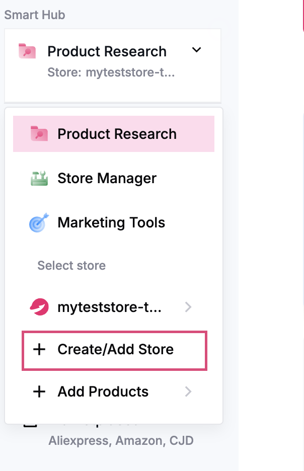 From the Left Menu, simply click on Create/Add Store Store to launch the Connect Store Popup